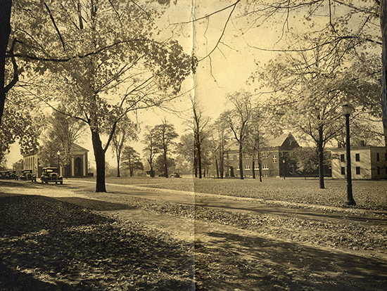 This beautiful photo is from the early 1930s. This is clear because of what is not there – Goodrich Hall which was dedicated in 1938. We can also see that Forest Hall [to the right of the picture] is where the Sparks Center is now.
