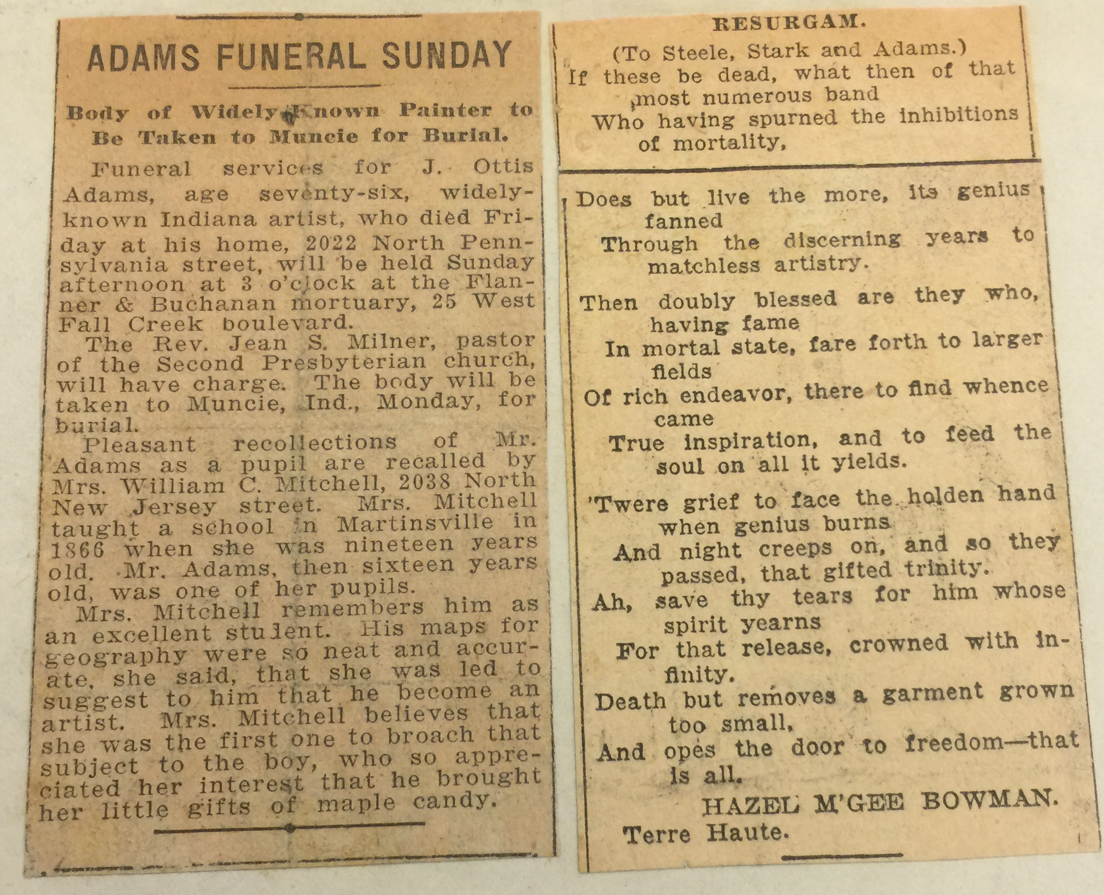 Memorial Announcement for J. Ottis Adams, including a pom for Adams, 1927, by Hazel M’Gee Bowman of Terre Haute, Indiana. Hear it read below by Tom Blaich.