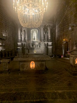 Today I had the opportunity to go to Wieliczka, the salt mine in Poland. We went down the first three levels which in total only made up 1 percent of the total depth of the salt mine at 135 meters. While walking down the mine there was a strong draft of air following us, and I could even hear the drafts from behind the doors we passed. There was a section down in the second level that was a church that was mostly carved out by three people which occasionally hosts weddings. Along the walk, I licked the salt-covered walls and tried some of the freshly produced salt water. The area we ended at used to have bungee jumping available for people to jump from really high up down to the final area. We walked over 800 stair steps and ended by going up in a lift. I am grateful for the opportunity to have this experience.